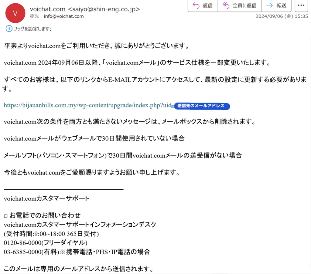 ウイルス感染、フィッシングサイトへの誘導、不正アクセスなどの危険がありますので、 もし当該メールが届いていた場合は、URLのクリックや添付ファイルの開封等は行わず、 メールごと削除していただきますようお願いいたします。