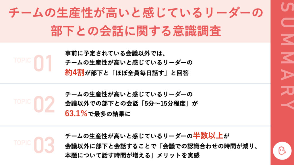 本調査は、リーダー・部下間での成果の上がる日常のコミュニケーションの実態を明らかにすることを目的としています。