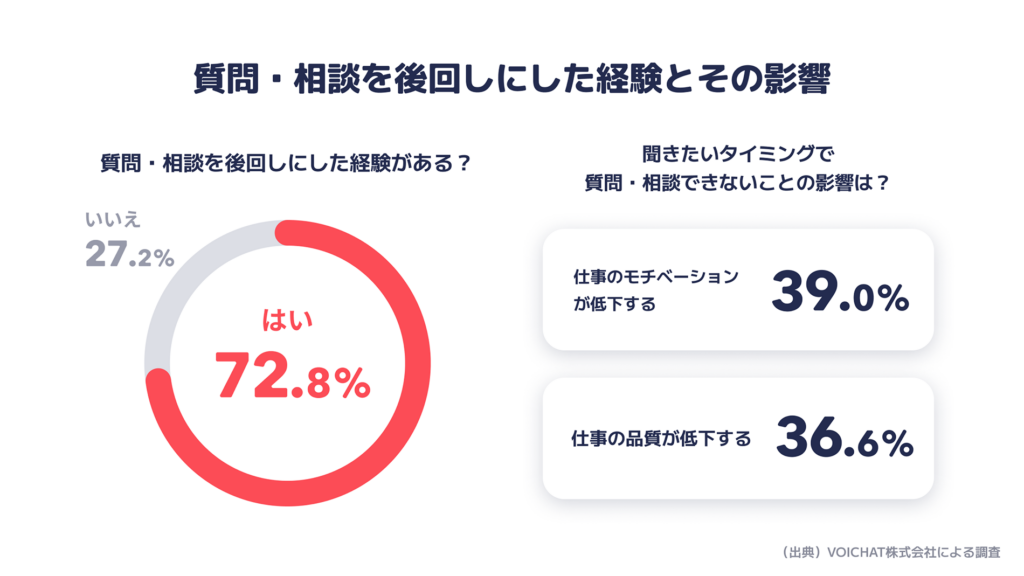 VOICHATが実施した調査では、「上司が不在がちでタイミングが合わない」(39.0%)、「リモートワークで話しかけづらい」(31.7%)といった回答がありました。