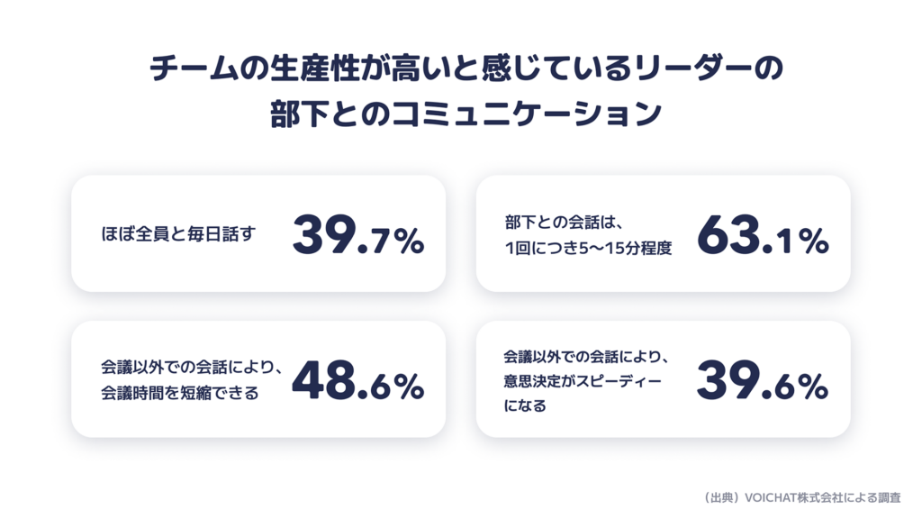VOICHATが実施したアンケート調査でも、自分のチームの生産性に自信を持っているリーダーほどこまめな声かけや気軽な会話を心がけているという結果が出ており、アジャイルトーク™が有効であることがわかります。