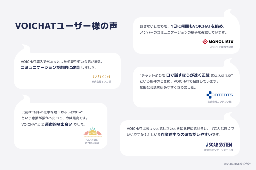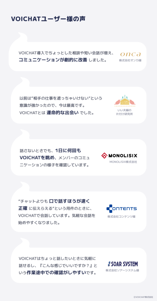 日常のビジネスコミュニケーションやリモートワークの運用に課題を持たれている方は、一度VOICHATを試してみてください。