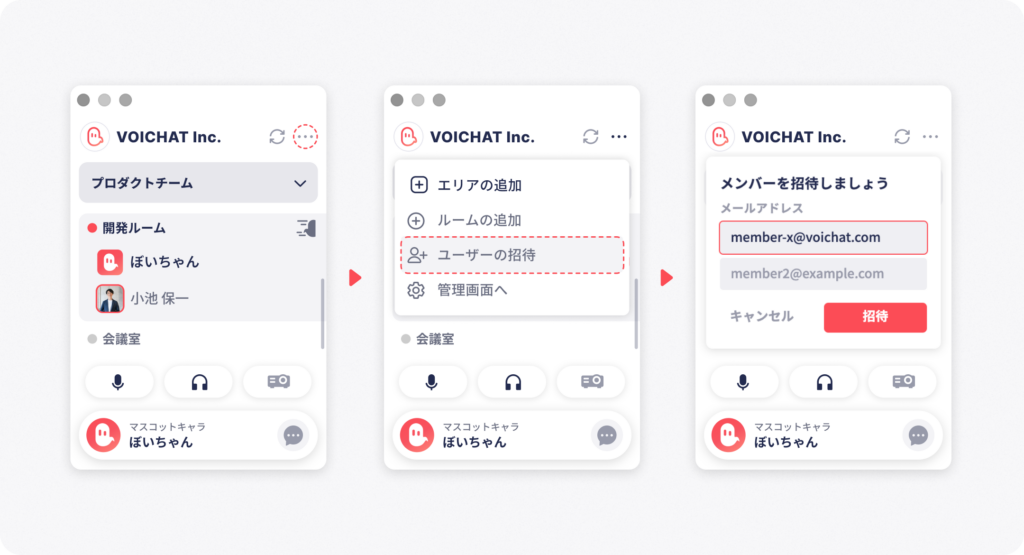 アプリ右上の「…」から招待画面へ進み、追加したいメンバーのメールアドレスを入力します。「招待」すると相手に招待メールが届き、本人認証が完了するとログインできるようになります。