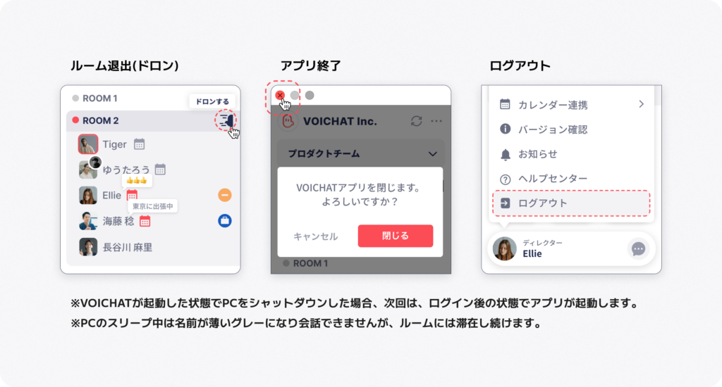 VOICHATからの退出には、以下3つの方法があります。どの方法でも他のメンバーからは見えなくなります。