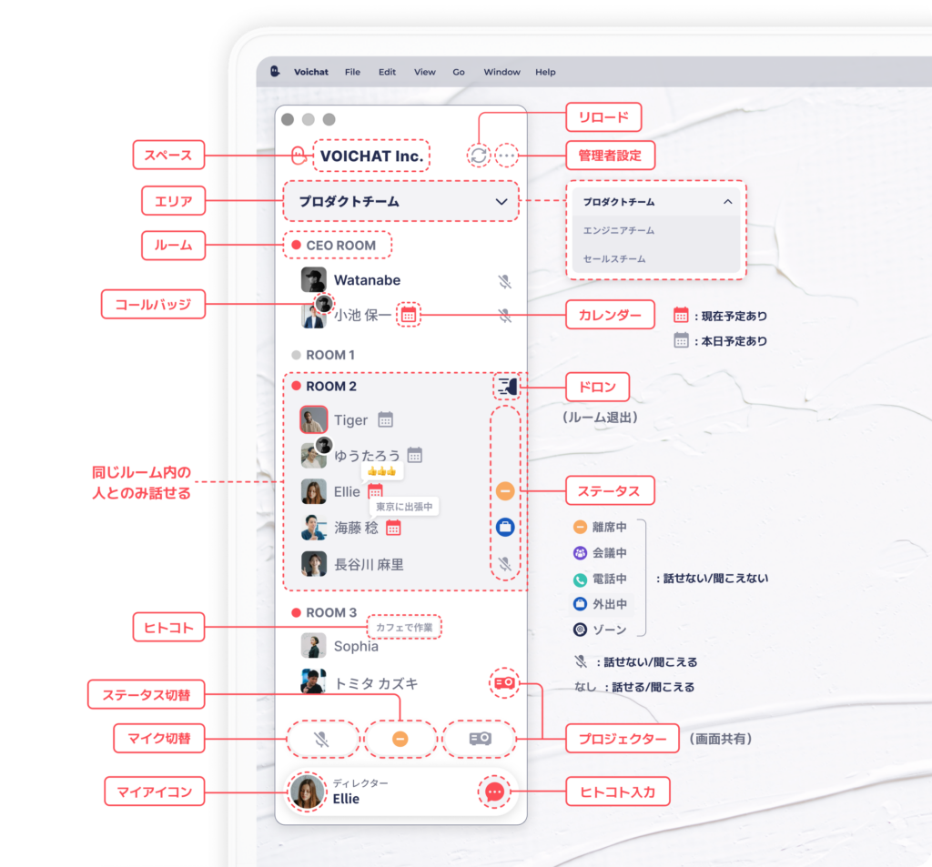 しかし、VOICHATではあえてカメラ機能を取っ払い、カメラ映りやデスク周り、プライバシーを気にせず、思い立ったらすぐ話しかけられるように設計しています。